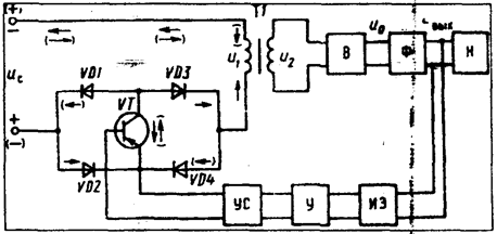 Как видно из рис. 6.29, ток первичной обмотки трансформатора Т1 в один полупериод протекает через диоды VD2, VD3 и транзистор VT. а в другой через VD1, VD4 и VT. Ток через транзистор VT имеет пульсирующий характер, но не меняет своего направления.