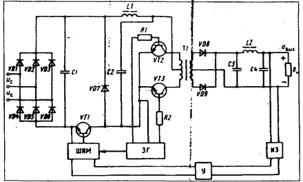 На рис. 6.34 изображена принципиальная схема ИВЭП с бестраисформаторным входом. Схема состоит из выпрямителя, выполненного по трехфазной мостовой схеме (VD! ... VD6), конденсатора C1, выполняющего роль предварительного фильтра, импульсного стабилиза­тора напряжения (VT1, VD7, L1, C2), преобразователя напряжения(VT2, VT3, T1), выходного выпрямителя и фильтра (VD8, VD9, СЗ. С4. L2). Транзисторы преобразователя управляются от задающего генератора (ЗГ). Регулирующий транзистор импульсного стабилизатора управляется импульсами, поступающими на его базу с выхода широтно-импульсного модулятора (ШИМ). Частота работы ШИМ синхронизируется импульсами от задающего генератора. Управление ШИМ осуществляется сигналом, поступающим на его вход с выхода усилителя (У). Принцип действия схемы рис. 6.34 заключается в следующем.