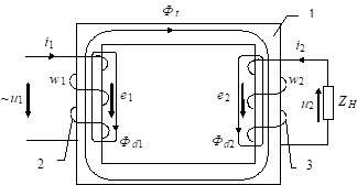 При подведении переменного напряжения u1 к первичной обмотке 2 в ней возникает переменный ток i1, который возбуждает в магнитопроводе 1 также переменный магнитный поток.