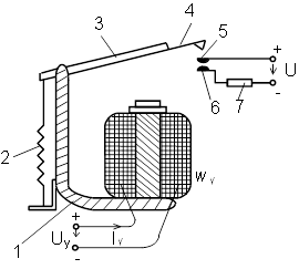 На рисунке показано устройство простейшего электромагнитного реле клапанного типа. При определенной магнитодвижущей силе (МДС) в цепи управления возникающая сила F притяжения якоря З к ярму 1 превышает силу противодействующей пружины 2. Воздушный зазор уменьшается. Клапан 4 нажимает на подвижный контакт 5 и прижимает его с силой F к неподвижному контакту 6. Управляемая цепь замыкается. Исполнительный элемент 7 производит требуемое действие.