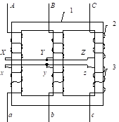 У трехфазных трансформаторов (рис. 11) магнитопровод 1 выполняют трехстержневым.