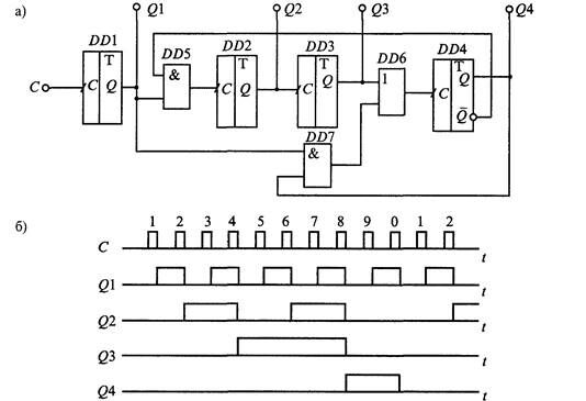 Рис 14 10 Схема декадного счетчика на счетных триггерах (а) и сигналы на его выходах (б)