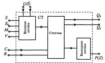 Обобщенная схема счетчика приведена на рис. 14.1. Счетчик СТ можно представить в общем случае как устройство, которое содержит входную логику, управляющую работой счетчика, и выходную логику, которая используется для указания окончания счета или формирования сигнала переноса Р. Для приведения счетчика в начальное состояние используется сигнал сброса, поступающий на вход R.