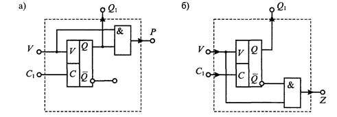 Синхронные счетчики. Для построения синхронных счетчиков используют различные типы счетных синхронных триггеров. Схемы одноразрядных синхронных счетчиков приведены на рис. 14.3. Эти схемы реализованы на синхронных счетных триггерах и логических элементах И для формирования сигналов переноса Р или займа Z. Схема одноразрядного синхронного суммирующего счетчика, приведенная на рис. 14.3 а, реализована подключением счетного входа С, к счетному входу триггера, а для формирования сигнала переноса Р использовано логическое произведение сигнала разрешения счета V и выходного сигнала Q, т. е. Р= VQ. Переключение триггера происходит по положительному перепаду сигнала на входе С и при наличии сигнала разрешения на входе V. При этом на выходе триггера Q и выходе переноса Р устанавливаются уровни логической единицы. При отрицательном перепаде сигнала на входе С состояние триггера не изменяется. Очередное переключение триггера произойдет только по новому положительному перепаду импульса на входе С, при наличии сигнала разрешения на входе V. Таким образом, счетная ячейка обеспечивает синхронное деление на два частоты входных импульсов.