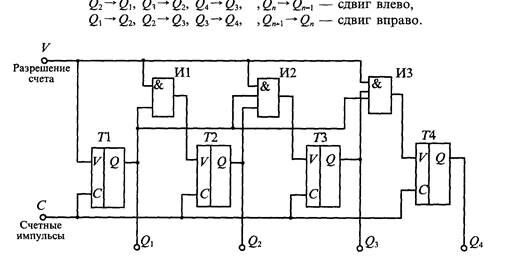 Регистры сдвига. Триггерным регистром сдвига называют совокупность триггеров с определенными связями между ними, при которых они действуют как единое устройство. В регистрах сдвига организация этих связей такова, что при подаче тактового импульса, общего для всех триггеров, выходное состояние каждого триггера сдвигается в соседний. В зависимости от организации связей этот сдвиг может происходить влево или вправо: