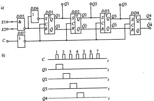 Ввод информации в регистр может выполняться различными способами, однако наиболее часто используют параллельный или последовательный ввод, при которых ввод двоичного числа осуществляется или одновременно во все разряды регистра, или последовательно во времени по отдельным разрядам. В счетчиках импульсов находят применение сдвигающие регистры с последовательным вводом и выводом и со сдвигом вправо. На рис. 14.6 а приведена схема четырехразрядного регистра сдвига, выполненного на ^-триггерах. В этой схеме каждый выход Q триггера соединен со входом S последующего разряда, а каждый выход Q — с входом R. Тактовые входы всех триггеров соединены вместе, и поступление сигнала синхронизации осуществляется одним общим импульсом через логический элемент И-НЕ (DD7). Состояние первого триггера определяется входными сигналами на входах Х и XI логического элемента И-НЕ (DD5). На вход XI подается текущая информация, а на вход Х2 сигнал разрешения ее передачи. Логические элемент НЕ (DD6) используется для инвертирования входного сигнала, подаваемого на вход S.