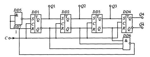 Для приведения счетчика в начальное состояние используется сигнал сброса R, поступающий одновременно на все входы R триггеров.