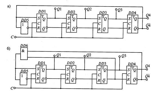 Рис. 14.9. Схема четырехразрядного счетчика Джонсона с четным (а) и нечетным (б) модулем счета