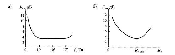 Рис. 19.2. Типовые зависимости коэффициента шума от частоты (а) и сопротивления источника сигнала (б)