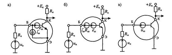 Рис. 19.3. Моделирование шумящего биполярного транзистора (а), замена источника тока шума (б) и результирующий источник напряжения шума (в)
