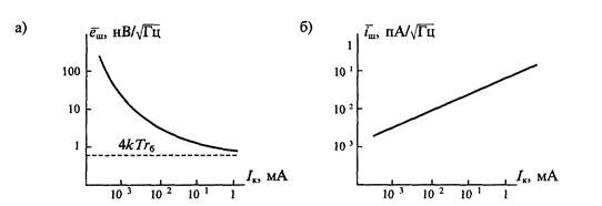 Рис. 19.4. Графики зависимостей напряжения шума (а) и тока шума (б) от тока коллектора для биполярного транзистора