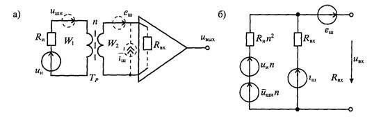 Схема входной цепи с приведенными к вторичной обмотке источниками сигнала и шума представлена на рис. 9.6 б. Напряжение сигнала на входе усилителя