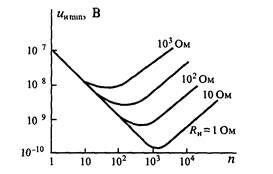 На рис. 19.7 приведены графики минимального усиливаемого сигнала при различных значениях коэффициента трансформации и сопротивления источника сигнала. Так, например, если входной трансформатор имеет коэффициент трансформации п =140 и сопротивление источника сигнала 2?,,= 100 Ом, то минимальный усиливаемый сигнал составляет {/„.щи, = 3,7 нВ.
