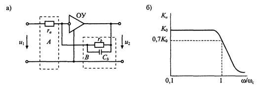 Рис. 20.2. Фильтр нижних частот с одноконтурной обратной связью первого порядка (а) и его амплитудпо-частотная характеристика (б)