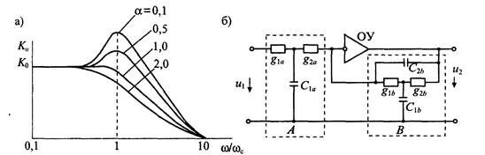 откуда следует, что при ст<2 полюсы коэффициента передачи будут комплексно-сопряженными, а при й>2 — вещественными. Амплитудно частотные характеристики ФНЧ второго порядка для различных значений ос<2 приведены на рис. 20.3 а. При а-* 0 добротность б—00 и фильтр будет возбуждаться на частоте (Ос.