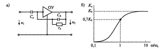 Рис. 20 4. Схема фильтра верхних частот первого порядка с одноконтурной обратной связью (а) и его амплитудно-частотная характеристика (б)