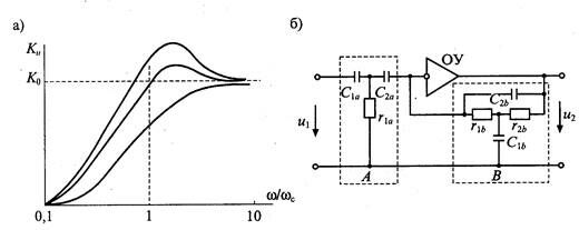 Рис 20.3. Амплитудно-частотная характеристика ФНЧ второго порядка (а) и его схема (б)