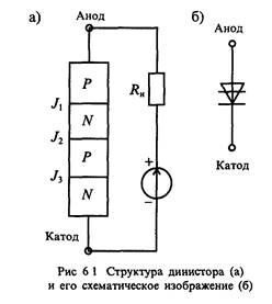 Динисторы. Динистором называется двухэлектродный прибор диодного типа, имеющий три ^-и-перехода. Крайняя область Р называется анодом, а другая крайняя область N — катодом Структура динистора приведена на рис 6.1 а. Три ^-и-перехода динистора обозначены как J, J^ и 7з. Схематическое изображение динистора приведено на рис 6.1 б
