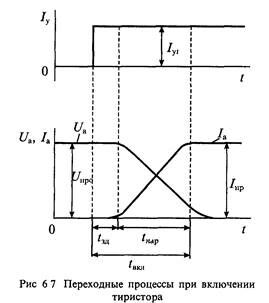 При включении тиристора током управления после подачи импульса тока /у, в управляющий электрод проходит некоторое время, необходимое для включения тиристора. Кривые мгновенных значений токов и напряжений в тиристоре при его включении на резистивную нагрузку приведены на рис 6 7 Процесс нарастания тока в тиристоре начинается спустя некоторое время задержки ;зд, которое зависит от амплитуды импульса тока управления /у, При достаточно большом