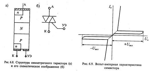 Симистор — это симметричный тиристор, который предназначен для коммутации в цепях переменного тока. Он может использоваться для создания реверсивных выпрямителей или регуляторов переменного тока. Структура симметричного тиристора приведена на рис. 6.8 а, а его схематическое обозначение на рис. 6.8 б. Полупроводниковая структура симистора содержит пять слоев полупроводников с различным типом проводимостей и имеет более сложную конфигурацию по сравнению с тиристором. Вольт-амперная характеристика симистора приведена на рис. 6.9.