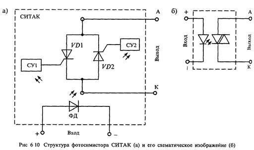 Фототиристоры и фотосимисторы — это тиристоры и симисторы с фотоэлектронным управлением, в которых управляющий электрод заменен инфракрасным свето-диодом и фотоприемником со схемой управления. Основным достоинством таких приборов является гальваническая развязка цепи управления от силовой цепи. В качестве примера рассмотрим устройство фотосимистора, выпускаемого фирмой «Сименс» под названием СИТАК. Структурная схема прибора СИТАК приведена на рис. 6.10 а, а его условное схематическое изображение — на рис. 6.10 б.