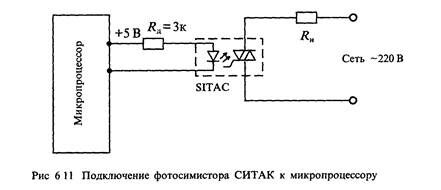 Такой прибор потребляет по входу управления светодиодом ток около 1,5мА и коммутирует в выходной цепи переменный ток 0,3 А при напряжении до 600В. Такие приборы находят широкое применение в качестве ключей переменного тока с изолированным управлением. Они также могут использоваться при управлении более мощными тиристорами или симисторами, обеспечивая при этом гальваническую развязку цепей управления. Малое потребление цепи управления позволяет включать СИТАК к выходу микропроцессоров и микро-ЭВМ. В качестве примера на рис. 6.11 приведено подключение прибора СИТАК к микропроцессору для регулирования тока в нагрузке, подключенной к сети переменного напряжения 220В при максимальной мощности до 66Вт.