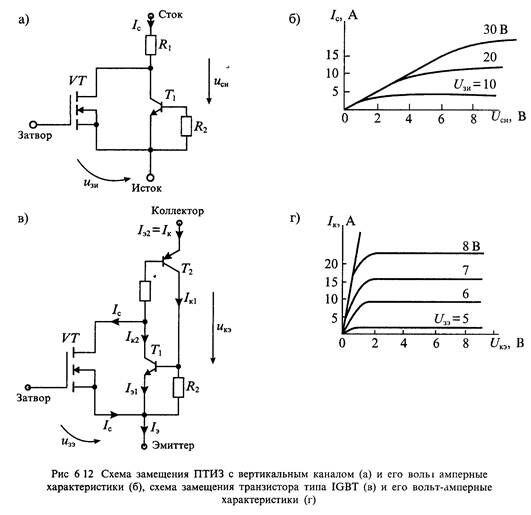 Структура транзистора IGBT аналогична структуре ПТИЗ, но дополнена еще одним/?-и-переходом, благодаря которому в схеме замещения (рис. 6.12 в) появляется еще один р-п-р-транзистор 72.