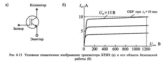 Условное схематическое изображение БТИЗ приведено на рис. 6.13. Это обозначение подчеркивает его гибридность тем, что изолированный затвор изображается как в ПТИЗ, а электроды коллектора и эмиттера изображаются как у биполярного транзистора.