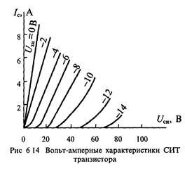 Несмотря на высокие характеристики СИТ и БСИТ транзисторов, они уступают ПТИЗ по быстродействию и мощности управления. Типовые вольт-амперные характеристики СИТ транзистора приведены на рис. 6.14. К достоинствам СИТ транзисторов следует отнести малое сопротивление канала в открытом состоянии, которое составляет 0,1... 0,025 Ом.