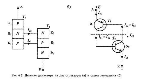 транзисторы и схема замещения приведены на рис. 6.2. При таком соединении коллекторный ток первого транзистора является током базы второго, а коллекторный ток второго транзистора является током базы первого. Благодаря этому внутреннему соединению внутри прибора есть положительная обратная связь