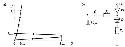 Рис. 6 3. Вольт-амперная характеристика динистора (а) и схема его включения (6)