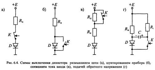Выключить динистор можно, понизив ток в нем до значения /„.ил или поменяв полярность напряжения на аноде. Различные способы выключения динистора приведены на рис. 6.4. В первой схеме прерывается ток в цепи динистора. Во второй схеме напряжение на динисторе делается равным нулю. В третьей схеме ток динистора понижается до /,ыхд включением добавочного резистора Ry