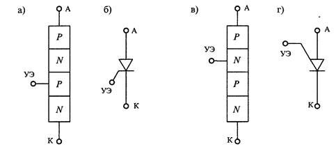 Рис 6 5 Структура тиристора с катодным управлением (а) и его условное схематическое обозначение (б), структура тиристора с анодным управлением (в) и его условное схематическое обозначение (г)