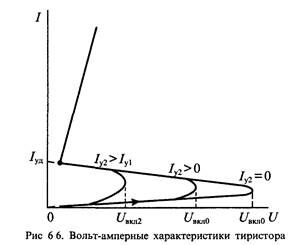тиристоров приведены к рис. 6 5 Вольт-амперная xapal теристика тиристора приведен на рис. 6.6 Она отличается с характеристики динистора теп что напряжение включения pi гулируется изменением тока цепи управляющего электрод, При увеличении тока ynpaani ния снижается напряжет включения. Таким образом, ti ристор эквивалентен динистор с управляемым напряжение включения.