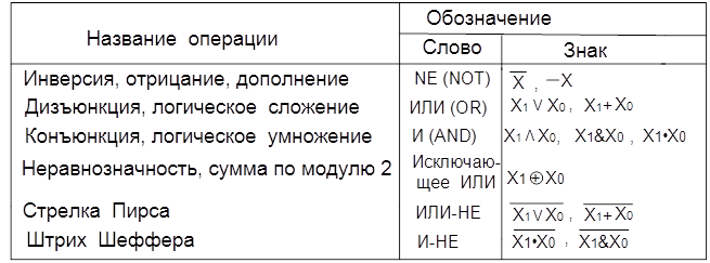 Основными логическими функциями двух переменных, используемыми в устройствах цифровой обработки информации являются: дизъюнкция (логическое сложение), конъюнкция (логическое умножение), сумма по модулю 2 (неравнозначность), стрелка Пирса и штрих Шеффера. Условные обозначения логических операций, реализующих указанные выше логические функции одной и двух переменных, приведены в таблице 3