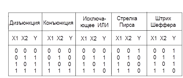 Таблица 4 – Таблицы истинности основных функций двух переменных