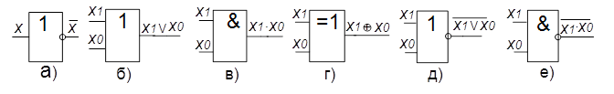 г) Исключающее ИЛИ, д) ИЛИ-НЕ, е) И-НЕ.