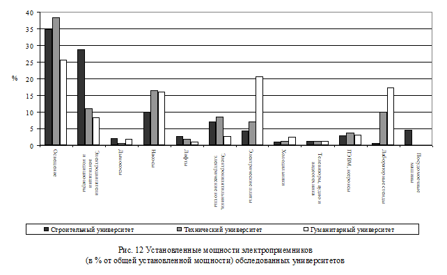 В табл. 4 - 6 и на рис 12 приведены установленные мощности электроприемников трех обследованных университетов. В табл. 7 приведены балансы потребления электрической энергии этих университетов. Из табл. 4 - 7 видно, что наибольшие резервы в экономии электрической энергии имеются в системах освещения, вентиляции и в котельных.