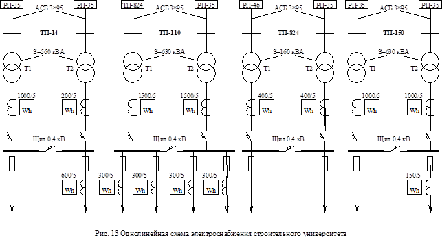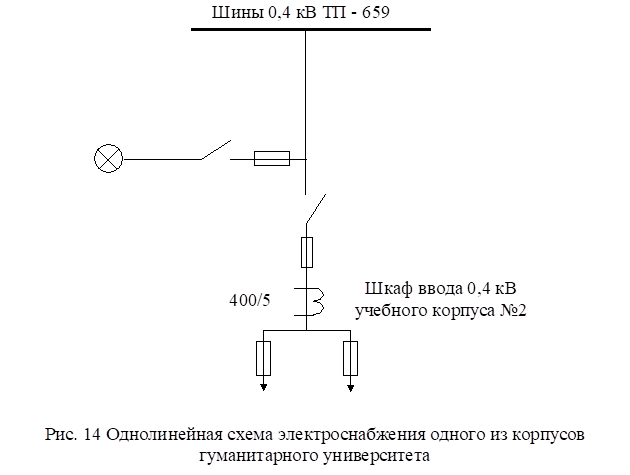На рис. 13 приведена однолинейная схема электроснабжения строительного университета, а на рис. 14 одного корпуса гуманитарного университета.