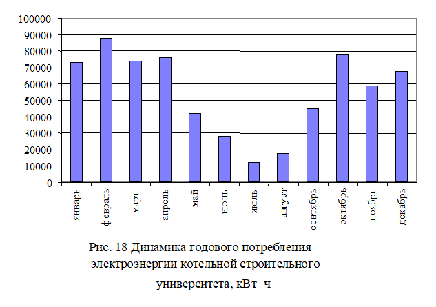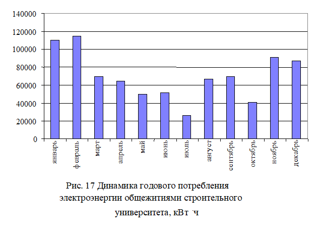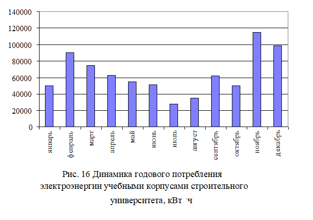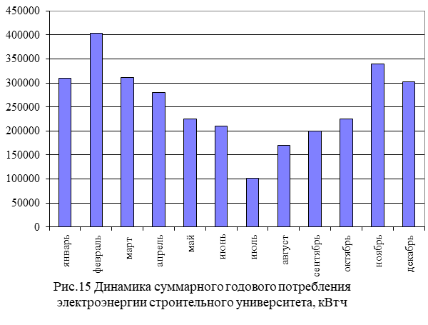 На рис. 15 - 18 приведены динамики годового потребления электроэнергии строительного университета, а на рис. 19, 20 суточные графики нагрузки учебного корпуса и общежития технического университета.