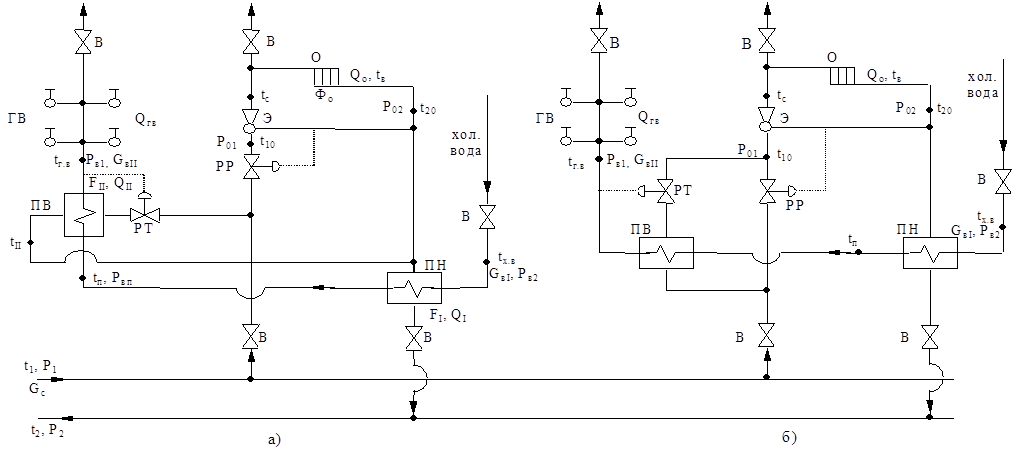 На рисунке 1а приведена смешенная, а на рисунке 1б последовательная схема питания отопления и горячего водоснабжения (обозначения на схемах : ПВ - подогреватель верхней ступени; ПН - подогреватель нижней ступени; О - радиаторы отопления; Э - элеватор; ГВ - горячая вода; РТ - регулятор температуры; РР - регулятор расхода; В - вентиль).