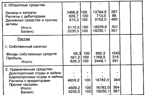 Табл. 4 наглядно показывает преимущества вертикального анализа – вследствие инфляции данные на начало и конец года по исходному балансу сравнить достаточно сложно, в то время как относительные показатели поддаются сравнению. Из приведенных данных можно сделать вывод, что принципиальных изменений в структуре баланса не произошло. Как положительную тенденцию следует рассматривать сокращение удельного веса дебиторской задолженности, хотя и на начало года этот показатель имел относительно небольшое значение и потому не оказывал существенного влияния на финансовое положение предприятия. Структура источников средств типична для многих отечественных торговых предприятий – собственный капитал имеет малый удельный вес. С позиции реальной рыночной экономики (например на Западе) такое положение, безусловно, не устроило бы инвесторов и кредиторов. Предприятие не пользуется ссудами банка, что достаточно распространено среди небольших предприятий,