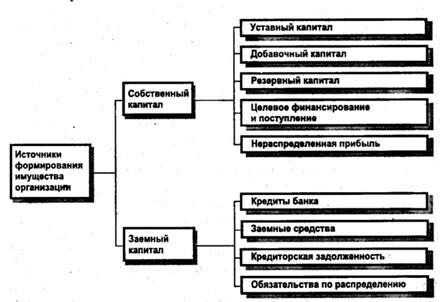 По источникам образования и целевому назначению имущество организаций подразделяют на собственное (собственный капитал) и заемное (созданное за счет обязательств; см. рис. 2).
