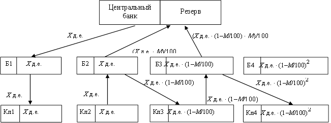 X д.е. – кредит Центрального банка, предоставляемый банку1 (Б1), который переходит от банка1 банку2 в оплату поставленных товаров или предоставленных услуг; М – норма обязательных резервов, %.