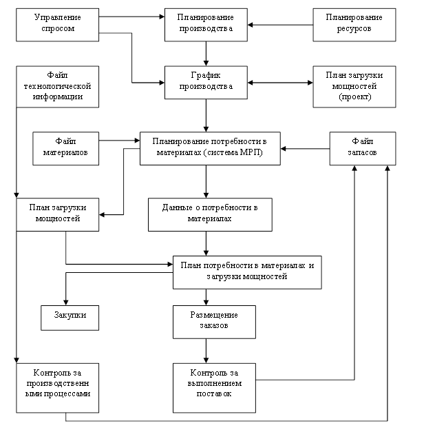 Существующая на сегодняшний день система МРП-2 рассматривается как второе поколение системы МРП. Различие систем заключается в уровне гибкости управления и широте выполняемых функций. МРП-2 включает в себя функции системы МРП в части определения потребности в материалах, а также функции управления технологическими процессами (см. рис. 3).