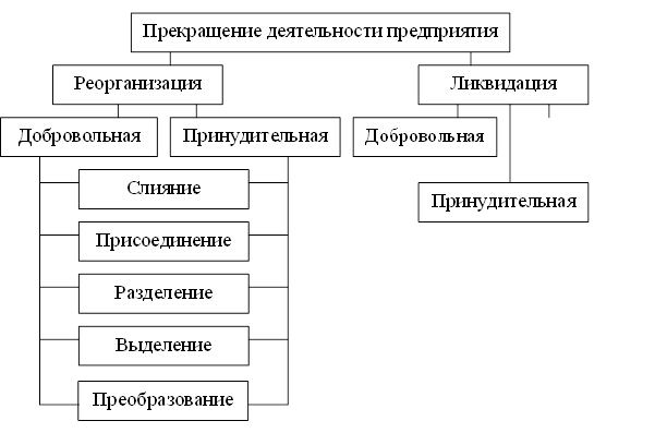 Прекращение деятельности предприятия происходит в результате его реорганизации или ликвидации. Понятие «реорганизация предприятия» включает различные формы изменения статуса предприятия как юридического лица, когда все права и обязанности (или их часть) переходят к другому предприятию, т.е. реорганизация предполагает использование процедуры правопреемства. Реорганизация предприятия может быть добровольной или принудительной. Реорганизация в добровольном порядке осуществляется по решению учредителей (участников) предприятия. Принудительная реорганизация осуществляется по решению судебных органов, либо по решению уполномоченных государственных органов.