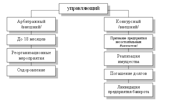 Таким образом, банкротство предприятия представляет собой целый комплекс взаимосвязанных мероприятий реорганизационного и ликвидационного характера. Центральной фигурой при проведении процедуры банкротства выступает управляющий. Управляющий может находиться в двух лицах (Рис. 13.4).