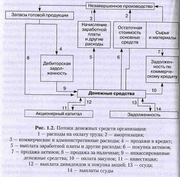 В действующей организации невозможно определить исходную1 и конечную точки денежного оборота. Объем денежных средств, которым располагает организация (центральная часть рисунка), изменяется во времени и зависит от характера производственного процесса, объема продаж, погашения дебиторской задолженности и др. Величина запасов сырья, незавершенного производства, готовой продукции на складе, дебиторской задолженности и подлежащий оплате коммерческий кредит также колеблются в зависимости от реализации, производственного процесса и финансовой политики организации в отношении кредиторской и дебиторской задолженности, формирования запасов.