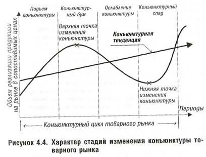 Смена всех стадий конъюнктуры рынка определенного вида продукции происходит в среднем за 1-2 года. При этом стадии конъюнктуры товарного рынка могут совпадать, а могут и не совпадать с фазами общеэкономического развития страны. Практика показывает, что конъюнктурный бум на рынке отдельных видов продукции может происходить даже в период общеэкономической депрессии, в то время как конъюнктурный спад в конкретном сегменте рынка может иметь место и в период подъема экономики.