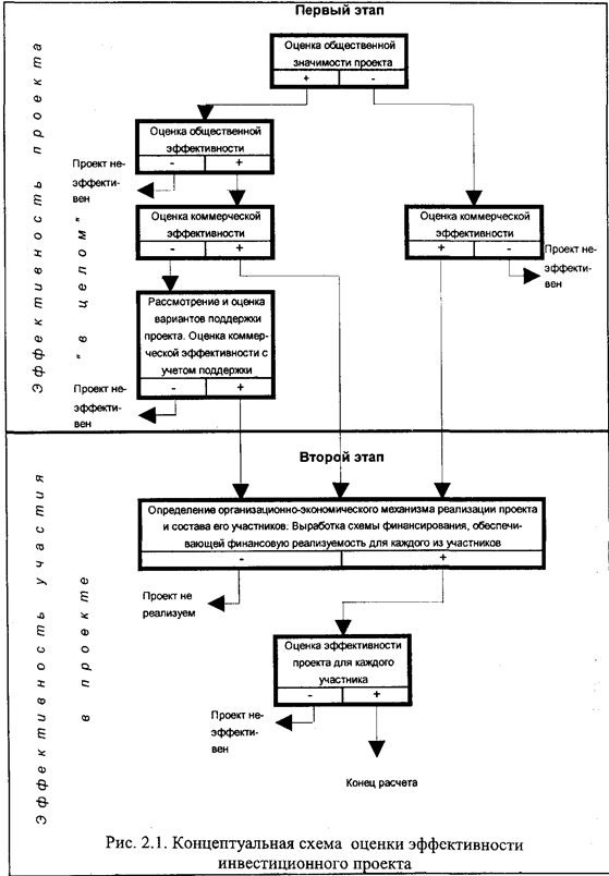 На первом этапе рассчитываются показатели эффективности проекта в целом. Цель этого этапа — агрегированная экономическая оценка проектных решений и создание необходимых условий для поиска инвесторов. Для локальных проектов оценивается только их коммерческая эффективность и, если она оказывается приемлемой, рекомендуется непосредственно переходить ко второму этапу оценки. Для общественно значимых проектов оценивается в первую очередь их общественная эффективность в соответствии с разд. 4. При неудовлетворительной общественной эффективности такие проекты не рекомендуются к реализации и не могут претендовать на государственную поддержку. Если же их общественная эффективность оказывается достаточной, оценивается их коммерческая эффективность в соответствии с разд. 5.